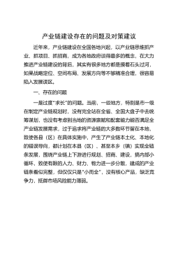 产业链建设存在的问题及对策建议近年来,产业链建设在全国各地兴起,以产业链思维抓产业、抓项目、抓招商,成为各地政府谈得最多的概念,在大力推进产业链建设的背后,其实有很多地方都是摸着石头过河,如果战略定位、空间布局、发展方向等不够精准合理,很容易陷入发展误区。一、存在的问题“”一是过度求长的问题。当前,一些地方,特别是市一级在制定产业链规划时,没有完全站在全省、全国大盘子中去统筹谋划,也没有考虑到当地的资源禀赋和配套能力能否满足全产业链发展需求,过于追求将产业链的大多数环节留在本地,致使各县(区)在具体实施中,产生了产业链本土化、本地化的错误导向,都计划在本县(区)、甚至本乡(镇)实现全链条发展,...