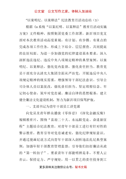公文堂公文写作之家,体制人加油站“以案明纪、以案释法”纪法教育月活动总结(1)根据《x系统“以案纪明、以案释法”教育月活动实施方案》文件精神,按照集团党委工作部署,新沂项目党支部对本次教育活动高度重视,有计划、有步骤、有重点的完成各项工作任务,形成上下结合、层层摆查、共同提高的良好局面。为进一步加强党的纪律建设基本要求,深入剖析违法违纪、违反中央八项规定精神的典型案例。以案明纪、以案释法,强化党内监督,强化责任担当。教育党员干部充分认清光大集团全面从严治党,开展违反中央八项规定精神的现实需要,增强领导干部纪法意识。引导公司全体人员以案促改,强化责任担当、坚定理想信念、牢记初心使命,筑牢对党忠诚...