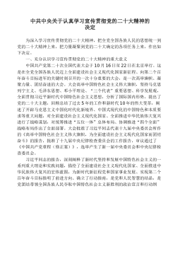 中共中央关于认真学习宣传贯彻党的二十大精神的决定为深入学习宣传贯彻党的二十大精神,把全党全国各族人民的思想统一到党的二十大精神上来,把力量凝聚到党的二十大确定的各项任务上来,作出如下决定。一、充分认识学习宣传贯彻党的二十大精神的重大意义中国共产党第二十次全国代表大会于10月16日至22日在北京举行。这是在全党全国各族人民迈上全面建设社会主义现代化国家新征程、向第二个百年奋斗目标进军的关键时刻召开的一次十分重要的大会,是一次高举旗帜、凝聚力量、团结奋进的大会。大会高举中国特色社会主义伟大旗帜,坚持马克思列宁主义、毛泽东思想、邓小平理论、“三个代表”重要思想、科学发展观,全面贯彻习近平新时代中国特...