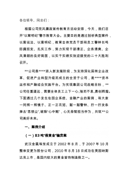 各位领导、同志们:根据公司党风廉政宣传教育月活动安排,今天,我们召开“以案明纪”警示教育大会。主要目的是通过剖析典型案件,以案说法、以案明纪,教育全体党员干部和员工警钟长鸣防腐拒变、扎实工作,努力实现干部清正、企务清爽、企风清朗的良好局面,以实干实绩实效迎接党的二十大胜利召开。**公司是****进入新发展阶段,为支持深化国有企业改革、促进产业转型升级而成立的全资子公司,是****资本运作和产融结合实施平台。为实现集团公司战略目标,**公司任重道远,需要全体员工上下一心,驰而不息,勇创辉煌。下面通过几个发生在国企系统、金融产业的案例,和大家一同照一照镜子、正一正衣冠、敲一敲警钟、拧一拧发条掸去“...