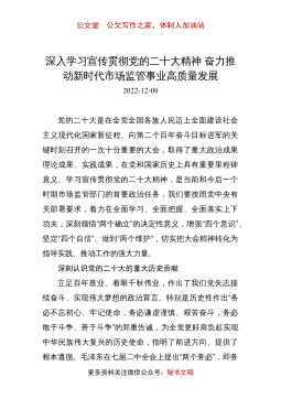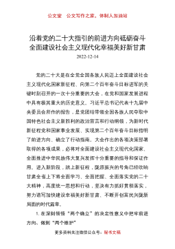 公文堂公文写作之家,体制人加油站沿着党的二十大指引的前进方向砥砺奋斗全面建设社会主义现代化幸福美好新甘肃2022-12-14党的二十大是在全党全国各族人民迈上全面建设社会主义现代化国家新征程、向第二个百年奋斗目标进军的关键时刻召开的一次十分重要的大会,在党和国家发展进程中具有极其重大的历史意义。习近平总书记代表十九届中央委员会所作的报告,是党团结带领全国各族人民夺取中国特色社会主义新胜利的政治宣言和行动纲领,为新时代新征程党和国家事业发展、实现第二个百年奋斗目标指明了前进方向、确立了行动指南。大会作出的各项决策部署取得的各项成果,必将对全面建设社会主义现代化国家、全面推进中华民族伟大复兴发挥十...