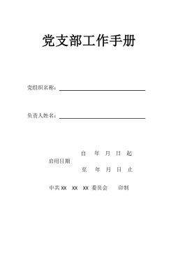 党支部工作手册党组织名称:负责人姓名:自年月日起启用日期至年月日止中共XXXXXX委员会印制入党誓词我志愿加入中国共产党,拥护党的纲领,遵守党的章程,履行党员义务,执行党的决定,严守党的纪律,保守党的秘密,对党忠诚,积极工作,为共产主义奋斗终身,随时准备为党和人民牺牲一切,永不叛党。使用须知一、本手册所列项目,是各党支部履责的基本要求,是党支部建设的基础工作,是XX党委检查考核各党支部工作的重要依据之一。二、本手册应由党支部书记或者党支部书记指派专人认真负责、实事求是填写。内容简明扼要、填写准确、字迹端正。三、本手册是党支部的重要档案资料,要妥善保管,不得遗失。四、XX党委、党总支至少每半年对...