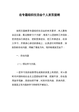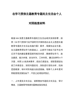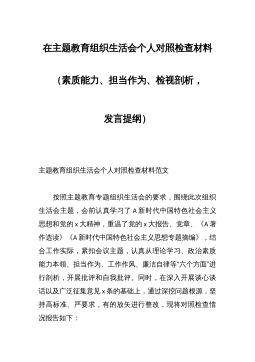 在主题教育组织生活会个人对照检查材料(素质能力、担当作为、检视剖析,发言提纲)主题教育组织生活会个人对照检查材料范文 按照主题教育专题组织生活会的要求,围绕此次组织生活会主题,会前认真学习了A新时代中国特色社会主义思想和党的x大精神,重温了党的x大报告、党章、《A著作选读》《A新时代中国特色社会主义思想专题摘编》,结合工作实际,紧扣会议主题,认真从理论学习、政治素质能力本领、担当作为、工作作风、廉洁自律等“六个方面”进行剖析,开展批评和自我批评。同时,在深入开展谈心谈话以及广泛征集意见x条的基础上,通过深挖问题根源,坚持高标准、严要求,有的放矢进行整改,现将对照检查情况报告如下: 一、20...