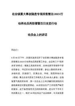 在全镇重大事故隐患专项排查整治2023行动再动员再部署暨百日攻坚行动动员会上的讲话同志们:X月XX日下午,区委区政府召开了全区重大事故隐患专项排查整治2023行动再动员再部署工作会,会议有三个“前所未有”的特点:规格之高前所未有,全体在家市管领导干部全部参会,书记区长亲自安排部署;参会人数前所未有,乡镇街道、区级部门、区属企业、学校、医院和各行业(领域)重点企业与安全工作相关人员500余人参加;会场凝重气氛前所未有,第一次在会上公布涉嫌失职渎职的问题线索移交纪委监委查处。XX的安全生产工作形势严峻空前紧张,处于备受领导关注的特殊时期,是今年下半年工作的重点之一。刚才XX同志传达了会议精神,今天...
