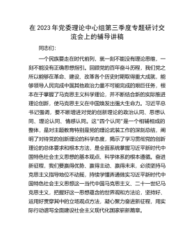 在2023年党委理论中心组第三季度专题研讨交流会上的辅导讲稿同志们:一个民族要走在时代前列,就一刻不能没有理论思维,一刻不能没有正确思想指引。回顾党的百年奋斗历程,我们党之所以能够在革命、建设、改革各个历史时期取得重大成就,能够领导人民完成中国其他政治力量不可能完成的艰巨任务,根本在于掌握了马克思主义科学理论,并不断结合新的实际推进理论创新,使马克思主义在中国焕发出强大生命力。习近平总书记强调,要不断增进对党的创新理论的政治认同、思想认“”同、理论认同、情感认同。这四个认同是一个相辅相成的整体,是对主题教育特别是党的理论武装工作的深刻总结,阐明了对待党的创新理论的科学态度,揭示了学习贯彻党的创...