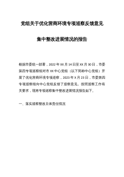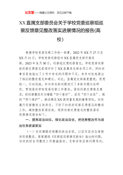 公文堂——海量公文资料,关注立即下载XX直属支部委员会关于学校党委巡察组巡察反馈意见整改落实进展情况的报告(高校)根据学校党委巡察工作统一部署,2022年XX月27日至XX月11日,学校党委巡察组对XX直属党支部开展巡察。2023年X月30日,巡察组反馈巡察意见。学校党委巡察组巡察反馈意见客观评价了XX直属党支部各项工作,同时实事求是地指出了工作中存在的问题和不足,有针对性地提出了相应的整改意见和建议。对此,直属党支部高度重视,思想统一,行动迅速,针对存在的问题进行了多轮专题讨论研究。贯彻落实学校党委巡察工作要求,落实巡察反馈意见要求,把巡察整改作为增强“四个意识”、坚定“四个自信”、做到“两...