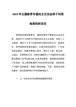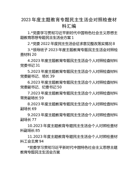 2023年度主题教育专题民主生活会对照检查材料汇编1.*党委学习贯彻习近平新时代中国特色社会主义思想主题教育思想专题民主生活会方案12.*党委2022年度民主生活会征求意见整改落实情况83.*领导班子2023年度主题教育专题民主生活会对照检查材料204.2023年度主题教育专题民主生活会个人对照检查材料党委书记315.2023年度主题教育专题民主生活会个人对照检查材料党委副书记、场长396.2023年度主题教育专题民主生活会个人对照检查材料党委副书记、纪委书记507.2023年度主题教育专题民主生活会个人对照检查材料常务副场长598.2023年度主题教育专题民主生活会个人对照检查材料副场长69...