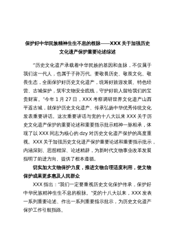 保护好中华民族精神生生不息的根脉——XXX关于加强历史文化遗产保护重要论述综述“历史文化遗产承载着中华民族的基因和血脉,不仅属于我们这一代人,也属于子孙万代。要敬畏历史、敬畏文化、敬畏生态,全面保护好历史文化遗产,统筹好旅游发展、特色经营、古城保护,筑牢文物安全底线,守护好前人留给我们的宝贵财富。”今年1月27日,XXX考察调研世界文化遗产山西平遥古城,就保护历史文化遗产、传承弘扬中华优秀传统文化发表重要讲话。这次重要讲话与党的十八大以来XXX关于历史文化遗产保护的重要论述和重要指示批示精神一脉相承,体现了以XXX同志为核心的dzy对历史文化遗产保护的高度重视。XXX关于加强历史文化遗产保护重...