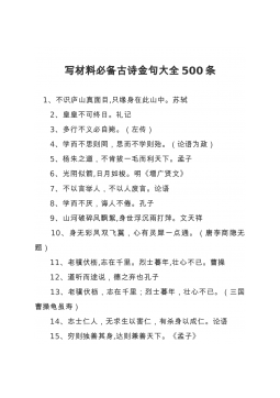 写材料必备古诗金句大全500条 1、不识庐山真面目,只缘身在此山中。苏轼 2、皇皇不可终日。礼记 3、多行不义必自毙。(左传) 4、学而不思则罔,思而不学则殆。(论语为政) 5、杨朱之道,不肯拔一毛而利天下。孟子 6、光阴似箭,日月如梭。明《增广贤文》 7、不以言举人,不以人废言。论语 8、学而不厌,诲人不倦。孔子 9、山河破碎风飘絮,身世浮沉雨打萍。文天祥 10、身无彩凤双飞翼,心有灵犀一点通。(唐李商隐无题) 11、老骥伏枥,志在千里。烈士暮年,壮心不已。曹操 12、道听而途说,德之弃也孔子 13、老骥伏枥,志在千里;烈士暮年,壮心不已。(三国曹操龟虽寿) 14...