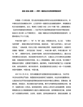 适应·适当·适度——评析一篇政治文化特征鲜明的佳作中国是一个文明古国,悠久的历史造就出世界无与伦比的深厚的政治文化。在中国社会历史发展的长河中,公文的写作一直是在社会发展的进程中,承载着政治和文化的双重责任。近日,笔者在《求是》杂志(2021年第7期)上看到的题为《迈向共同富裕的光辉实践——习近平总书记倡导推动的闽宁扶贫协作模式的经验启示》的文章(以下简称例文),就是一篇政治文化特征鲜明的经验型佳作,主要体现在以下三个方面。半亩方塘一鉴开——“时”与“势”适应,体现政治文化。古人说:“文章合为时而著”,提倡文章应为时代而写就。胡适也说:“是什么时代的人,说什么时代的话。”也有此意。机关公文是一...