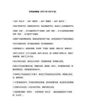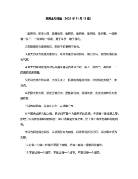 天天金句精选(2021年11月13日)1.敢担当,躬身入局、挺膺负责,敢担急、敢担难、敢担险、敢担重,一级带着一级干、一级做给一级看,勇于斗争、敢于胜利。2.把能使的力量使到位,把该干的事情干到位。3.最大的动力就是负重前行、攻坚克难的省会担当,横刀立马、舍我其谁的省会气概。4.最大的障碍就是面对标兵越来越远而望洋兴叹,陷入一鼓作气、再而衰、三而竭的颓废怪圈。5.把目光放在桥头堡、主攻工业上,抓住的就是扬优势、补短板的关键子、主攻点。6.把握大势大局、坚定正确方向,把比较优势、规模优势、先发优势转化为发展胜势。7.以忠诚筑魂,以奋斗兴业,以清廉立身。8.牢记忠诚是为政之魂,把绝对可靠作为最鲜明...