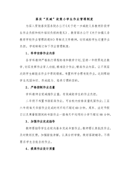 落实“双减”政策小学生作业管理制度为深入贯彻落实国务院办公厅《关于进一步减轻义务教育阶段学生作业负担和校外培训负担的意见》、教育部办公厅《关于加强义务教育学校作业管理的通知》等相关文件精神,切实减轻学生过重作业负担,学校特制订如下作业管理制度:1、科学安排作业内容各学科教师严格执行课程标准和教学计划,坚持一年级零起点教学,切实发挥作业育人功能,精准设计作业,精选作业内容,让不同层次的学生都能在作业中得到锻炼,布置科学合理有效作业,达到帮助学生巩固知识、形成能力、培养习惯的目的。2、严格控制作业总量学科教师自觉减缩作业量,有效减轻学生的作业负担。二年级不布置书面家庭作业,可在校内安排适量巩固作业...