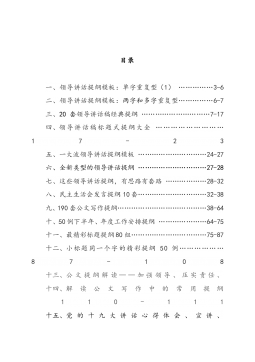 目录一、领导讲话提纲模板:单字重复型(1)……………3-6二、领导讲话提纲模板:两字和多字重复型……………6-7三、20套领导讲话稿经典提纲…………………………7-17四、领导讲话稿标题式提纲大全………………………17-23五、一大波领导讲话提纲模板…………………………24-27六、全新类型的领导讲话提纲…………………………27-28七、这些领导讲话提纲,有思路有套路………………28-32八、民主生活会发言提纲10套…………………………32-38九、190套公文写作提纲…………………………………38-64十、50例下半年、年度工作安排提纲…………………64-75十一、最精彩标题提纲80组………...