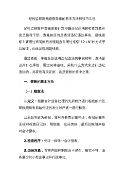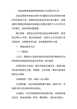 纪检监察巡视巡察查账的基本方法和技巧汇总纪检监察案件查账主要针对涉嫌违纪违法的检查对象和党员领导干部,查账的目的是查清违纪违法事实。巡视巡察主要通过查阅账目发现疑点并通过巡察“12+N”种方式予以验证,由此发现问题线索。通过查账,掌握足以说明违纪违法的事实材料,查清是运用什么手段、通过何种途径、采取什么方式来进行违纪违法的,并获取有关证据,这是查账的重中之重。一、查账的基本方法(一)顺查法1.定义:根据会计业务处理的先后程序进行检查的方法,即按照所有原始凭证的发生时序逐一进行检查。以原始凭证为依据,核对并检查记账凭证,根据记账凭证核对检查日记账、明细账、总分类账,最后以账簿来核对会计报表。2....