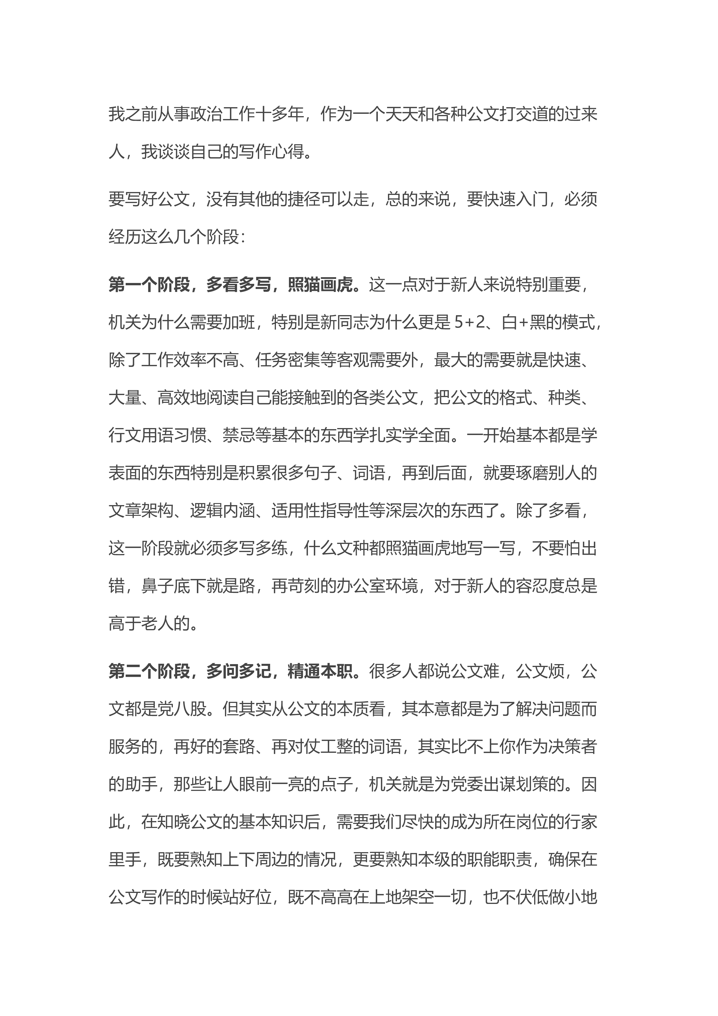 我之前从事政治工作十多年,作为一个天天和各种公文打交道的过来人,我谈谈自己的写作心得。要写好公文,没有其他的捷径可以走,总的来说,要快速入门,必须经历这么几个阶段:第一个阶段,多看多写,照猫画虎。这一点对于新人来说特别重要,机关为什么需要加班,特别是新同志为什么更是5+2、白+黑的模式,除了工作效率不高、任务密集等客观需要外,最大的需要就是快速、大量、高效地阅读自己能接触到的各类公文,把公文的格式、种类、行文用语习惯、禁忌等基本的东西学扎实学全面。一开始基本都是学表面的东西特别是积累很多句子、词语,再到后面,就要琢磨别人的文章架构、逻辑内涵、适用性指导性等深层次的东西了。除了多看,这一阶段就必...