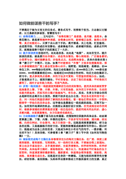 谈谈提高机关公文写作能力的方法和途径关于如何提高机关文稿写作水平的问题。我思考再三,深切地感受到,机关文稿写作从模仿到入门,从入门到创新,每一步跨越都离不开学习、实践、总结。一、学习是基础,要多学、会学首先要清楚学什么,其次要明白如何学。前者是学习的内容,后者是学习的方法。先讲学习的内容。结合实际工作,我觉得在机关起草文稿要注重五个方面的学习。一是学习中央领导讲话,重在把握精神实质。中央领导讲话稿,有的在《人民日报》公开发表,有的在《中办通报》上内部刊登,有条件的同志都应该深入认真及时地学习领会,这对于我们了解当前党和国家的中心工作及政策走势,从更高的层面认识和把握本单位的工作任务,是非常有帮...