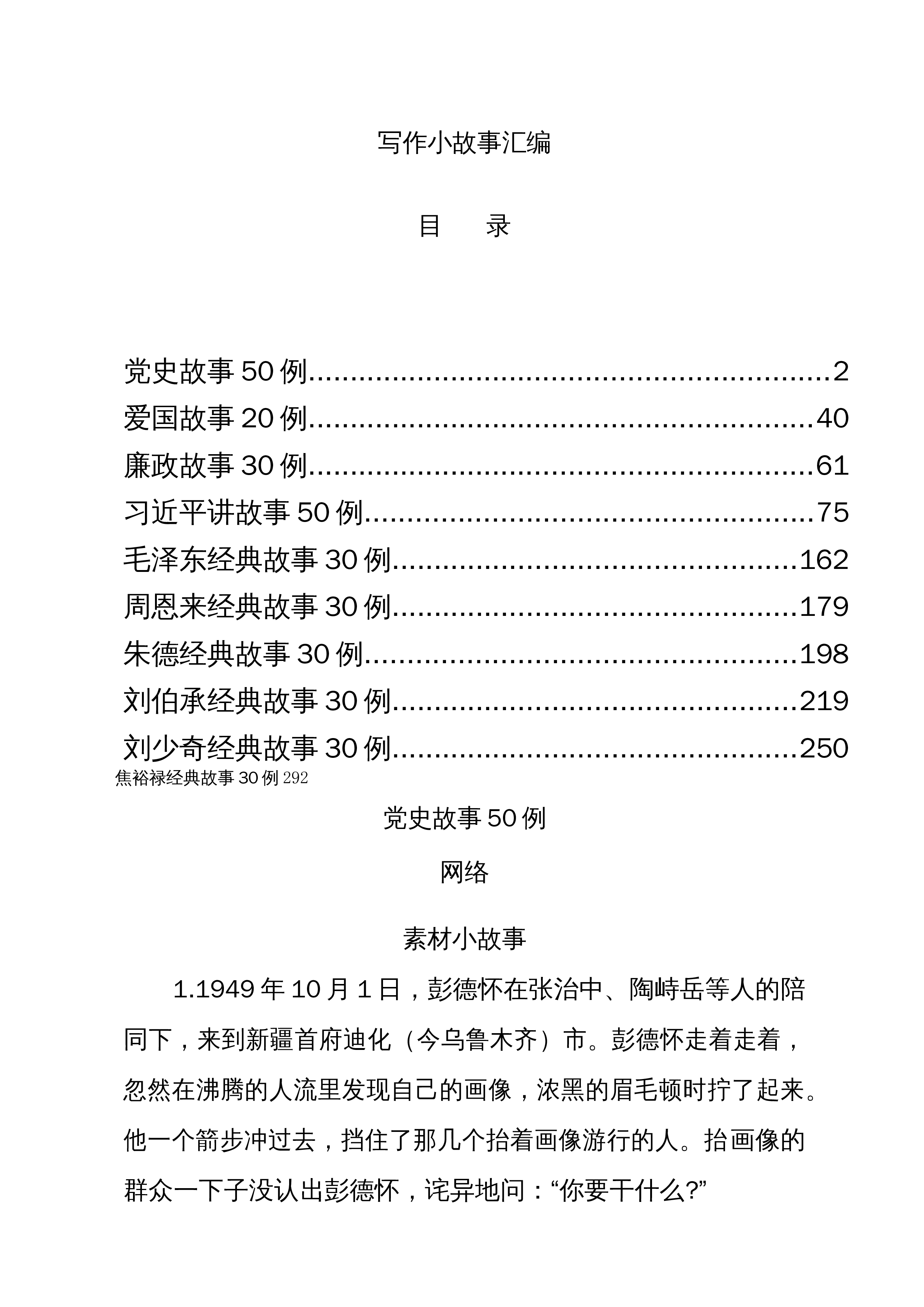 写作小故事汇编目录党史故事50例..............................................................2爱国故事20例............................................................40廉政故事30例............................................................61习近平讲故事50例.....................................................75毛泽东经典故事30例............