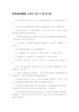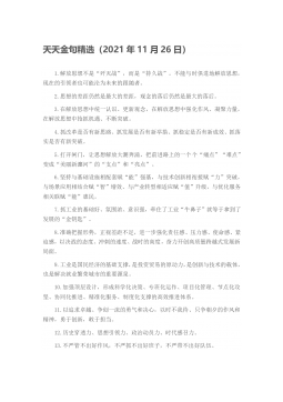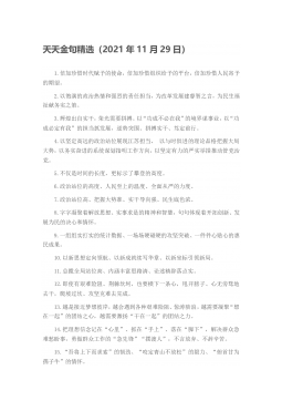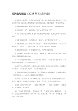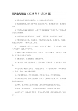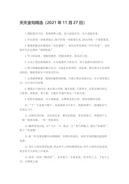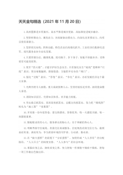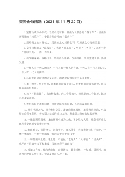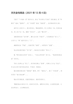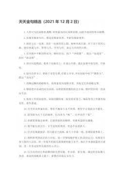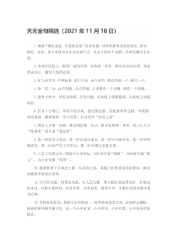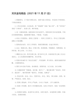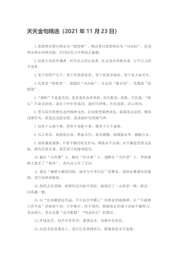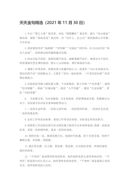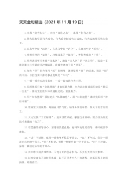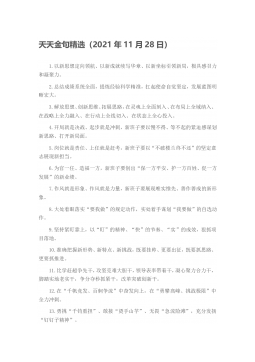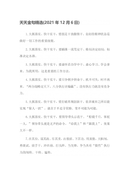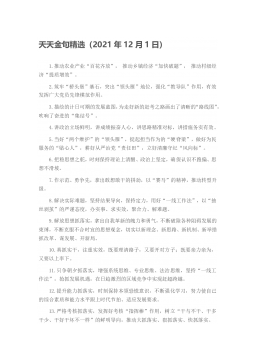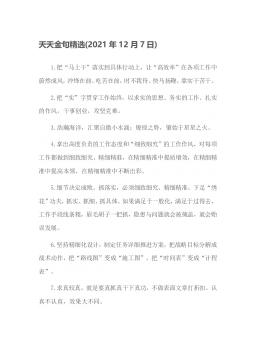 天天金句精选(2021年12月7日)1.把“马上干”落实到具体行动上,让“高效率”在各项工作中蔚然成风,冲锋在前、吃苦在前,时不我待、快马扬鞭,靠实干苦干。2.把“实”字贯穿工作始终,以求实的思想、务实的工作、扎实的作风,干事创业,攻坚克难。3.浩瀚海洋,汇聚自微小水滴;燎原之势,肇始于星星之火。4.拿出高度负责的工作态度和“细致细究”的工作作风,对每项工作都做到细致细究、精细精准,在精细精准中提质增效,在精细精准中提高本领,在精细精准中不断出彩。5.细节决定成败。抓落实,必须细致细究、精细精准、下足“绣花”功夫,抓实、抓细、抓具体。如果满足于一般化,满足于过得去,工作手段线条粗,眉毛胡子一把...