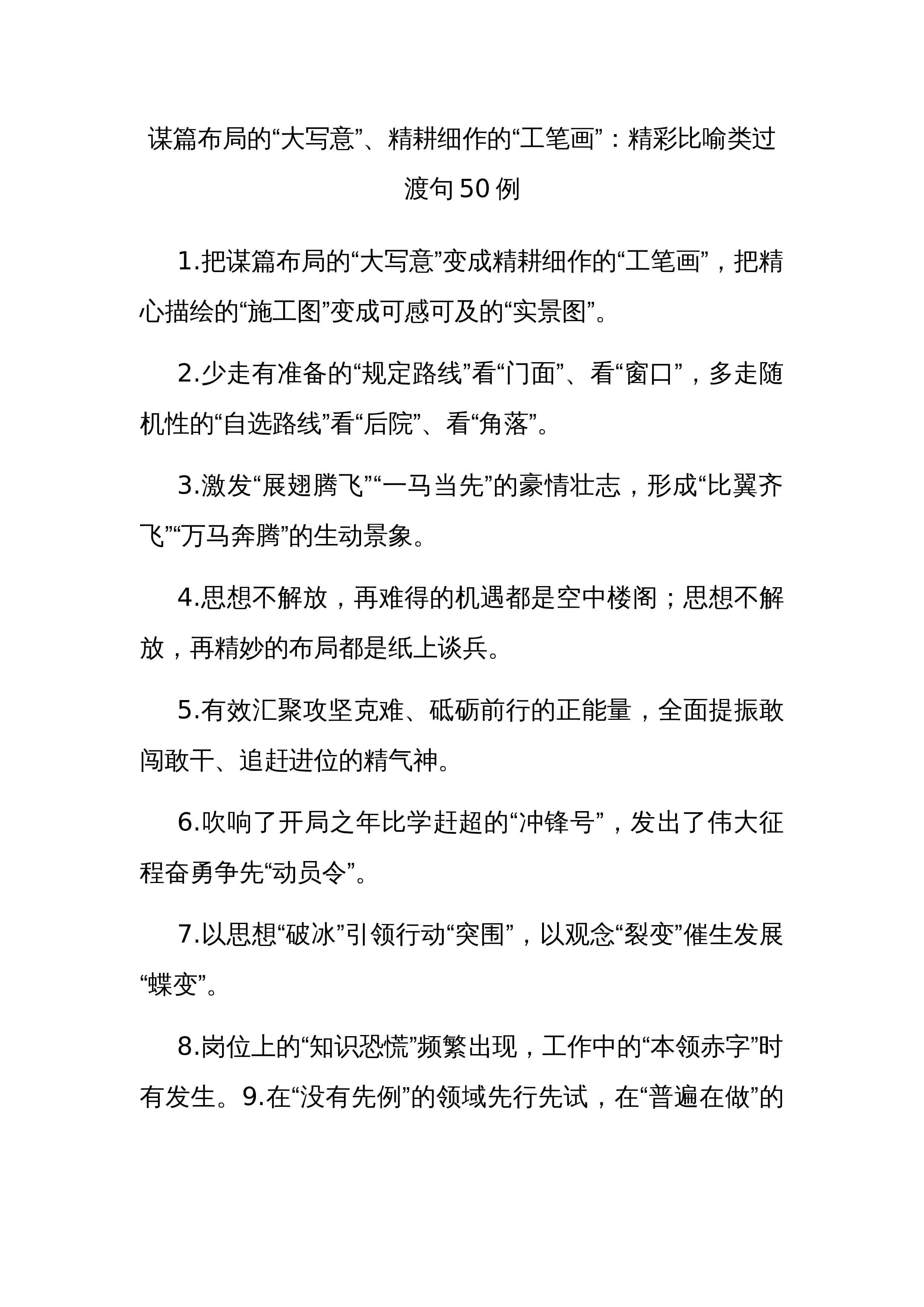 谋篇布局的“大写意”、精耕细作的“工笔画”:精彩比喻类过渡句50例1.把谋篇布局的“大写意”变成精耕细作的“工笔画”,把精心描绘的“施工图”变成可感可及的“实景图”。2.少走有准备的“规定路线”看“门面”、看“窗口”,多走随机性的“自选路线”看“后院”、看“角落”。3.激发“展翅腾飞”“一马当先”的豪情壮志,形成“比翼齐飞”“万马奔腾”的生动景象。4.思想不解放,再难得的机遇都是空中楼阁;思想不解放,再精妙的布局都是纸上谈兵。5.有效汇聚攻坚克难、砥砺前行的正能量,全面提振敢闯敢干、追赶进位的精气神。6.吹响了开局之年比学赶超的“冲锋号”,发出了伟大征程奋勇争先“动员令”。7.以思想“破冰”引...