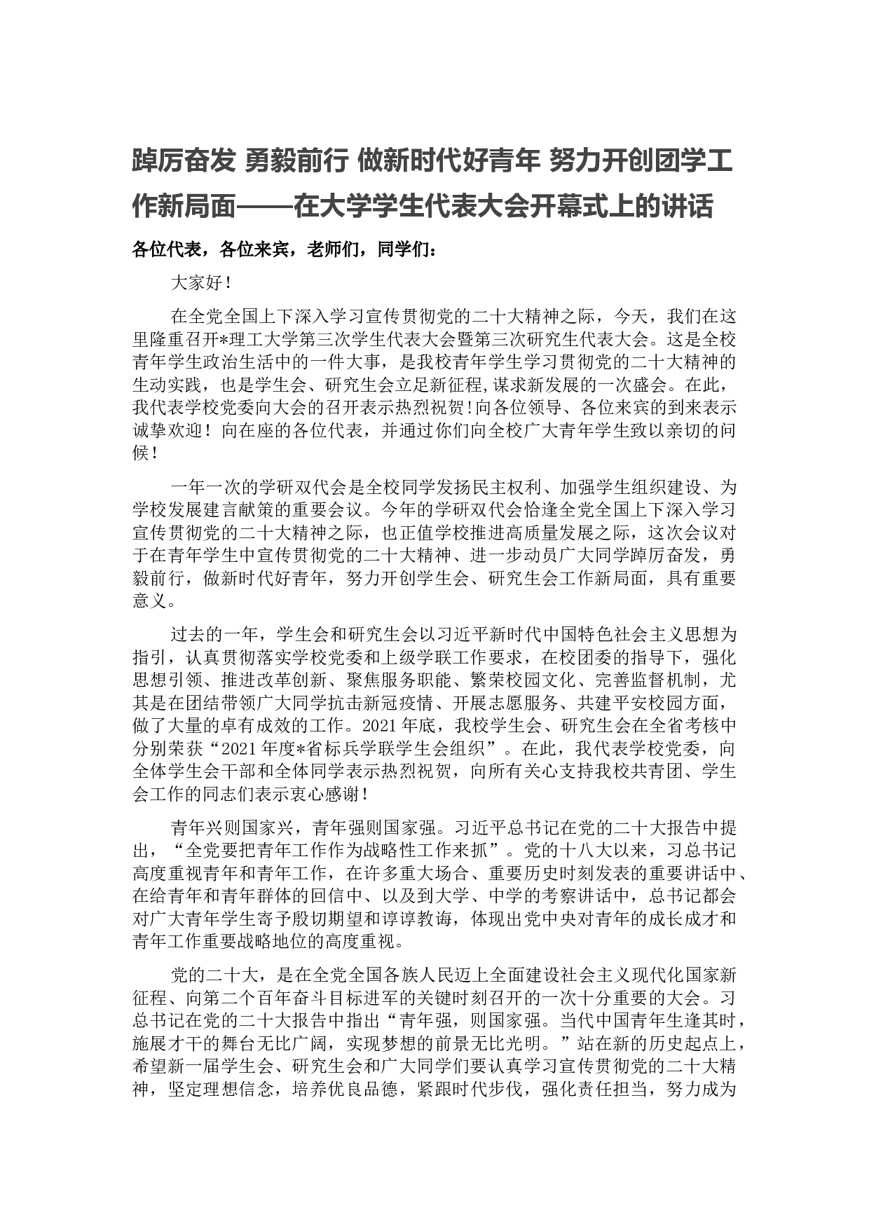 踔厉奋发勇毅前行做新时代好青年努力开创团学工作新局面——在大学学生代表大会开幕式上的讲话各位代表,各位来宾,老师们,同学们:大家好!在全党全国上下深入学习宣传贯彻党的二十大精神之际,今天,我们在这里隆重召开*理工大学第三次学生代表大会暨第三次研究生代表大会。这是全校青年学生政治生活中的一件大事,是我校青年学生学习贯彻党的二十大精神的生动实践,也是学生会、研究生会立足新征程,谋求新发展的一次盛会。在此,我代表学校党委向大会的召开表示热烈祝贺!向各位领导、各位来宾的到来表示诚挚欢迎!向在座的各位代表,并通过你们向全校广大青年学生致以亲切的问候!一年一次的学研双代会是全校同学发扬民主权利、加强学生组...