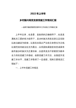 2022年上半年乡村振兴局党支部党建工作情况汇报—适用于基层党委党支部年中工作总结/工作情况汇报上半年以来,在县委、县政府的正确领导下,在县直属机关工委的有力指导下,县乡村振兴局党支部立足实际以政治建设为统领,以落实全面从严治党主体责任为主线以规范党内政治生活为重点,以巩固拓展脱贫攻坚成果有效衔接乡村振兴为主要目标,以提高党员干部素质为根本全力夯实党建工作基础,创新党建工作方法,全面提升党建工作水平,党建工作取得了一定成绩,现将主要情况汇报如下:一、上半年党建工作情况1、提高政治站位,强化党的政治建设。加强学习贯彻党的十九大精神、习近平新时代中国特色社会主义思想以及习近平总书记系列重要讲话精神...