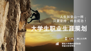 大学生职业生涯规划人生如登山一样,只要坚持,终会成功!汇报人/掌上公文网献给大学期间迷茫的你希望对你有帮助CONTENTS01-自我分析Selfanalysis03-目标externalenvironment02-职业决策Careerdecision-making04-实施计划Carryouttheplan自我分析01你了解你自己吗你了解你的兴趣吗?经常对于自己得不到或不具备的东西感兴趣当兴趣没有成为工作的时候,你对它爱不释手,当兴趣成为了工作以后呢?还需要考虑“成就感”,因为这是推动你前进的内在动力纠错环节对于性格的模式化解读性格特质则往往会在相当长的一段时期内保持稳定,并因此而产生固定的行...