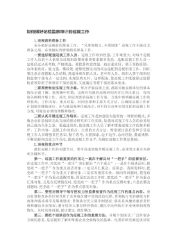 如何做好纪检监察审计的巡视工作1.巡视前的准备工作充分做好巡视前的筹备工作。“凡事预则立,不预则废”巡视工作不能打无准备之战,必须做好周密细致的准备工作。一要选好配强巡视工作人员。巡视工作政治性强,工作难度大,对每个巡视工作人员的个人素质及巡视组的整体素质要求都非常高。选配巡视工作人员一定要经过认真考核,严格挑选。要把那些党性强、政治素质好、敢于坚持原则,总体素质好、能力强、懂政策,能够把握全局的同志选配到巡视组来工作。同时,要注意合理搭配人员结构,离退休和在职人员、老中青人员、组织人事干部和纪检监察干部各占一定比例,实现优势互补。这样配备,使巡视工作既能保证监督检查领导班子和领导干部的需要,...