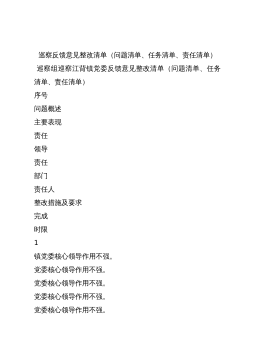 巡察反馈意见整改清单(问题清单、任务清单、责任清单)巡察组巡察江背镇党委反馈意见整改清单(问题清单、任务清单、责任清单)序号问题概述主要表现责任领导责任部门责任人整改措施及要求完成时限1镇党委核心领导作用不强。党委核心领导作用不强。党委核心领导作用不强。党委核心领导作用不强。党委核心领导作用不强。镇党委领导权威弱化。江背镇企业较多且实力雄厚,有一定影响力,由于特定的历史原因,江背镇三个党委并存,企业财力雄厚,解决群众问题比镇党委政府方便,镇党委引领力、驾驭力、领导作用弱化。张登武喻孟华基层党建办李晓阳王丹1、切实加强党的领导,全面从严治党;2、完善政务服务中心软硬件设施,配齐配强工作人员,开展...