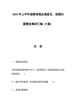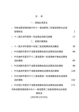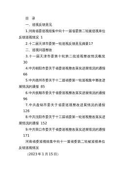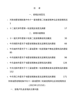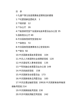 目录十九届**第九轮巡视整改进展情况的通报1.**纪委国家监委机关12.**组织部123.**办公厅264.**政策研究室**全面深化改革委员会办公室355.国务院办公厅496.中共国务院研究室党组627.**保密办728.中共国务院港澳事务办公室党组819.**财办9210.中共国家发展改革委党组10411.中共人力资源和社会保障部党组12012.中共退役军人事务部党组13513.**军民融合发展委员会办公室14914.中共民政部党组15815.中共国家安全部委员会17316.中共国家税务总局委员会18317.中共交通运输部党组19918.中共国家粮食和物资储备局党组21419.中共国家邮政...
