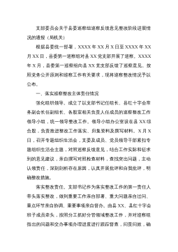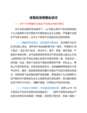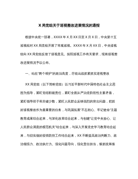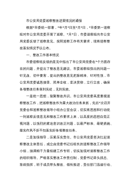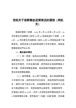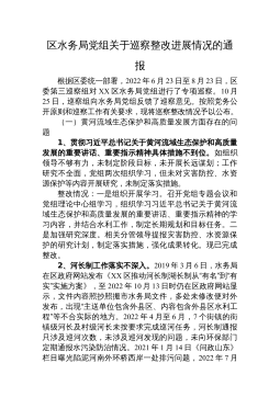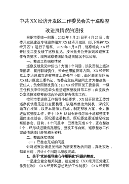 中共XX经济开发区工作委员会关于巡察整改进展情况的通报根据市委统一部署,2022年3月21日至4月27日,市委开发区建设专项巡察组对XX经济开发区(以下简称“XX经开区”)进行了巡察。2022年8月8日,巡察组向XX经开区党工委反馈了巡察意见。按照党务公开原则和巡察工作有关要求,现将巡察整改阶段进展情况予以公布。一、整改工作组织情况巡察反馈意见中指出3方面8个问题,涉及贯彻上级决策部署、履行职能责任、资金使用监管等方面。XX经开区党工委迅速成立巡察整改工作领导小组,由区政府副区长XX经开区党工委书记、管委会主任周超同志作为整改第一责任人,负全面整改责任;由XX经开区党工委委员、一级主任科员申申...
