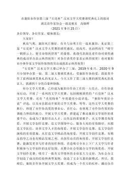 在襄阳市作协第三届“石花杯”汉水文学大奖赛颁奖典礼上的致词湖北省作家协会一级巡视员高晓晖(2021年9月25日)各位领导、各位作家、媒体朋友:大家好!秋高气爽,襄阳风日独好。有幸与永明主任一起来襄阳,见证第三届“石花杯”汉水文学大奖赛的颁奖盛况,很高兴。也油然而生“晴空一鹤排云上,便引诗情到碧霄”的豪情。我谨代表湖北省作协对颁奖盛典的成功举办表示热烈祝贺!对各位获奖作家表示热烈祝贺!也对襄阳市全体作家文学创作取得的突出成就表示热烈祝贺!“石花杯”汉水文学大赛已举办了三届,2019年6月,2020年9月分别举办第一届、第二届大赛颁奖典礼,受襄阳作协抬爱,我很荣幸作了前两届颁奖典礼的见证人。今天又...