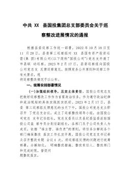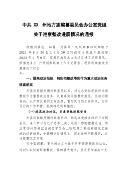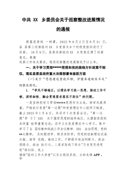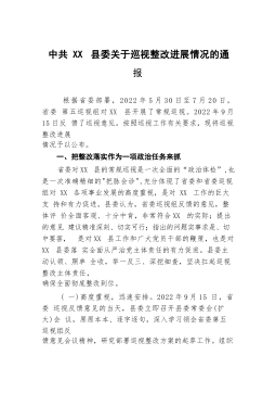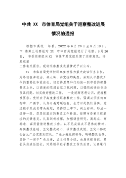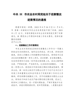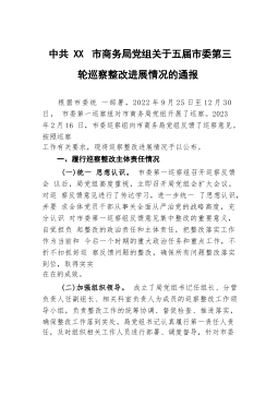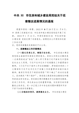 中共XX市住房和城乡建设局党组关于巡察整改进展情况的通报根据市委统一部署,2022年8月26日至11月8日,市委第三巡察组对XX市住房和城乡建设局党组开展了巡察。2023年1月12日,市委巡察组向XX市住房和城乡建设局党组反馈了巡察意见。按照党务公开原则和巡察工作有关要求,现将巡察整改进展情况予以公布。一、巡察整改工作开展情况(一)强化思想认识,增强行动自觉。市住房城乡建设局党组全盘接受巡察组反馈的意见,深刻认识到这次整改是一次难得的政治"体检",深入学习贯彻习近平新时代中国特色社会主义思想,习近平总书记关于巡视整改工作重要指示精神,《习近平关于城市工作论述摘编》,贯彻落实党的二十大精神和习近...