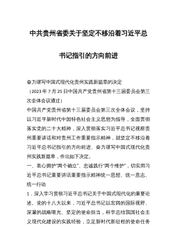 中共贵州省委关于坚定不移沿着习近平总书记指引的方向前进奋力谱写中国式现代化贵州实践新篇章的决定(2023年7月25日中国共产党贵州省第十三届委员会第三次全体会议通过)中国共产党贵州省第十三届委员会第三次全体会议,坚持以习近平新时代中国特色社会主义思想为指导,全面贯彻落实党的二十大精神,深入贯彻落实习近平总书记视察贵州重要讲话和对贵州工作重要指示精神,就坚定不移沿着习近平总书记指引的方向前进、奋力谱写中国式现代化贵州实践新篇章,作出如下决定。一、衷心拥护“两个确立”、忠诚践行“两个维护”,切实用习近平总书记重要讲话重要指示精神统一思想、统一意志、统一行动1.深入学习贯彻习近平总书记关于中国式现代...