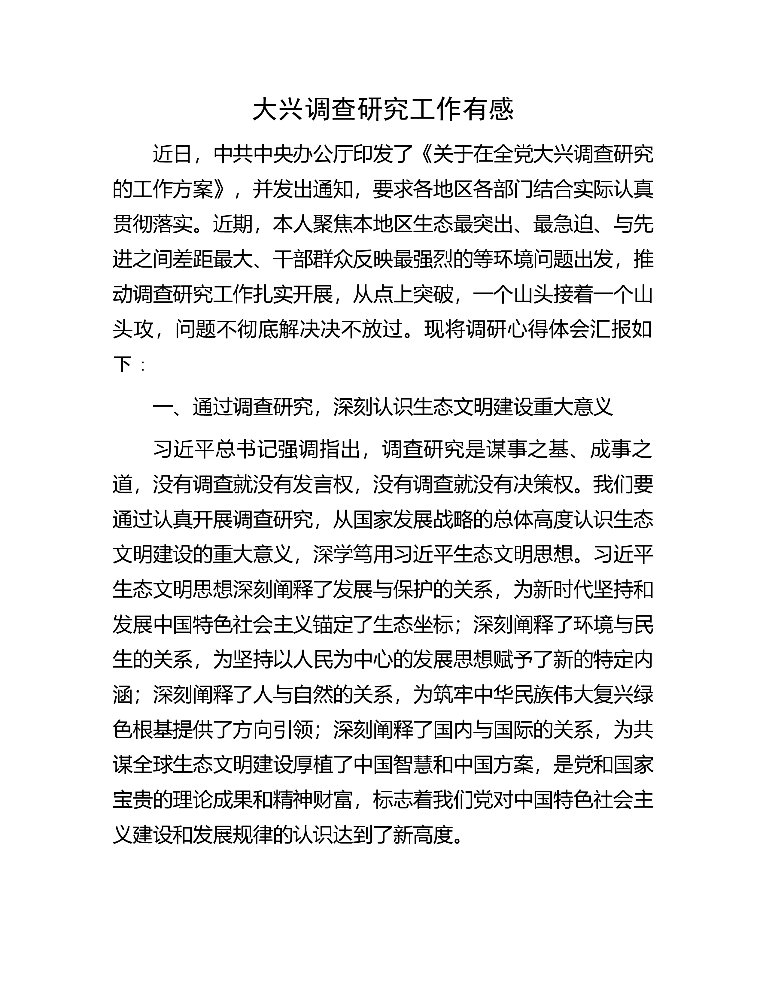 学习感悟:奔赴基层一线以实际行动大兴调查研究之风xxx总书记深刻指出“调查研究是谋事之基、成事之道”,多次强调“要在全党大兴调查研究之风”。近期我通过深入学习中办印发《关于在全党大兴调查研究的工作方案》文件精神。年轻干部作为党和国家事业发展的“生力军”,要积极响应党中央号召,勇于担当作为,奔赴基层一线,真正以实际行动大兴调查研究之风,持续强化调查研究基本功。一、把学习贯彻《通知》文件精神与理论武装结合起来,在进一步思想淬炼中夯实坚定不移的理想信念。当前,至关紧要的,是要把学习贯彻中办印发《关于在全党大兴调查研究的工作方案》通知文件精神作为我们的首要政治任务、作为目前理论学习的重中之重,以上率下...