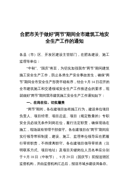 合肥市关于做好“两节”期间全市建筑工地安全生产工作的通知各县(市)区、开发区建设主管部门,在肥各建设、施工监理等单位:“中秋”、“国庆”将至,为切实加强我市“两节”期间建筑施工安全生产工作,防止各类生产安全事故发生,确保“两节”期间全市安全生产形势平稳有序,结合9月14日召开的全市建筑施工和交通领域安全生产工作推进会的要求,现就做好“两节”期间我市建筑施工安全生产工作通知如下:一、在岗在位、切实履责“两节”期间,各在建项目如有施工行为,建设单位项目负责人、项目经理、项目总监、项目(规定数量的)专职安全员必须无条件到岗在位,履行法定职责,确保现场在施工,现场就有管理干部值守。各在建项目在“两节”...