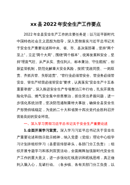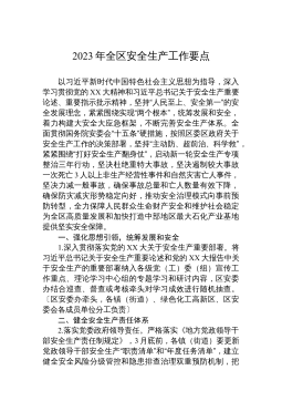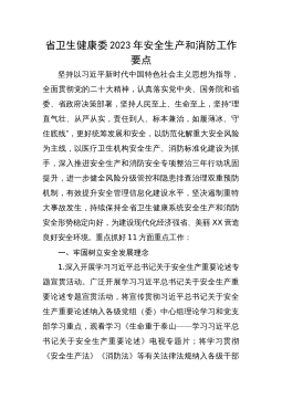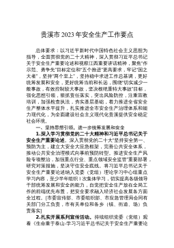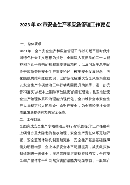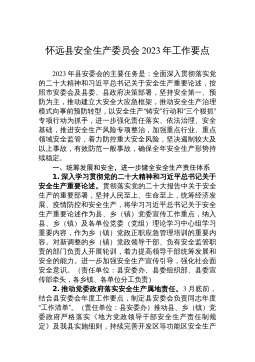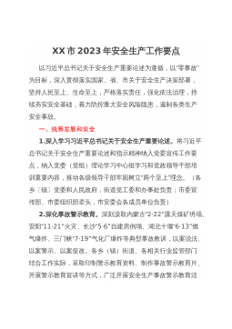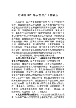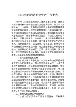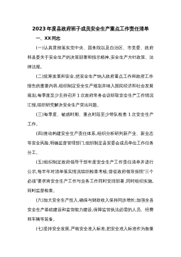 2023年度县政府班子成员安全生产重点工作责任清单一、XX同志(一)认真贯彻落实党中央、国务院以及自治区、市党委、政府和县委关于安全生产的决策部署和指示精神,安全生产方针政策、法律法规。(二)统筹发展和安全,把安全生产纳入政府重点工作和政府工作报告的重要内容,组织制定安全生产规划并纳入国民经济和社会发展规划,每季度至少主持召开1次政府常务会议听取安全生产工作情况汇报,组织研究解决安全生产突出问题。(三)每季度、敏感时期、重点时段至少带队检查1次安全生产工作。(四)推动构建安全生产责任体系,组织分析研判新产业、新业态等安全风险,明确监督管理部门,组织制定县安委会成员单位工作任务分工。(五)组织制...