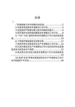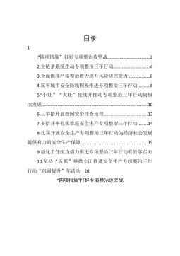 目录1.“四项措施”打好专项整治攻坚战............................22.全链条系统推动专项整治三年行动.......................43.全面摸排严格整治着力提升风险防控能力.............64.筑牢城市安全防线积极推进专项整治三年行动.......85.“小灶”“大灶”接续开推动专项整治三年行动向纵深发展..........................................................................106.三举措开展校园安全排查治理...........................1...