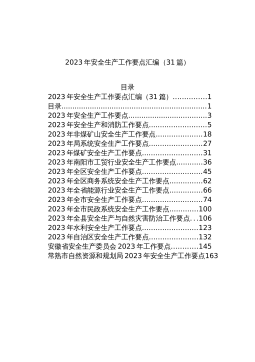 2023年度安全生产工作要点:2023年度安全生产工作要点汇编(45篇)1.2023年XX文旅行业安全生产和消防安全工作要点42.2023年全市住建领域安全生产工作要点..............93.2023年XX区应急局安全生产基础工作要点......174.2023年XX市建设安全生产专业委员会工作要点235.2023年XX市卫生健康系统安全生产工作要点...296.2023年XX县工贸行业安全生产监管工作要点...337.2023年安全生产工作要点...............................378.2023年度工贸行业安全生产监管工作要点.........409.2...