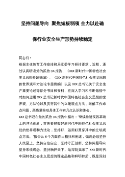 坚持问题导向聚焦短板弱项全力以赴确保行业安全生产形势持续稳定同志们:根据主体教育工作安排和局党委学习研讨要求,近期,通过认真研读党的贰拾DA报告、《XXX新时代中国特色社会主义思想专题摘编》、《XXX新时代中国特色社会主义思想的世界观和方法论专题摘编》以及习近平总书记关于安全生产重要论述等部分书目和资料,在深入学习和不断领悟中对如何运用习近平总书记新时代中国特色社会主义思想的世界观、方法论以及贯穿其中的立场观点方法,破解工作难点问题,高质量推动具体工作有几点认识和体会。习近平总书记在党的贰拾DA报告中指出:“继续推进实践基础上的理论创新,首先要把握好新时代中国特色社会主义思想的世界观和方法论,...