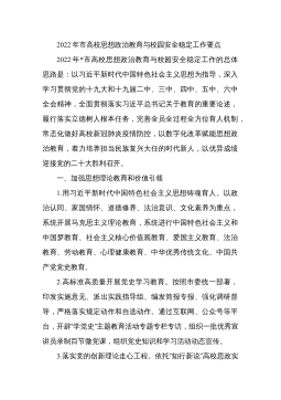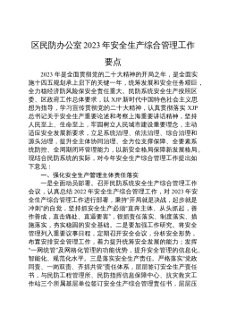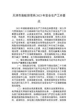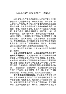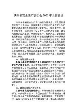 2023年全市住建领域安全生产工作要点2023年全市住建领域安全生产工作的总体要求:坚持以XJP新时代中国特色社会主义思想为指引,深入学习贯彻党的二十大精神和XJP总书记关于安全生产、应急救援、综合减灾的重要论述、重要指示批示精神,坚持人民至上、生命至上,坚持安全第一、预防为主,始终把保护人民群众生命财产安全作为最现实的“国之大者”,健全完善“大安全、大应急、大救援框架,推动安全治理模式向事前预防型转换,深入推进安全专项整治,加强重点行业领域安全监管,完善应急管理体制机制.提高各类自然灾害和重大突发事件应对处置能力,推动高水平安全与高质量发展动态平衡,为奋力谱写“强富美高”新如泉建设提供住建力...