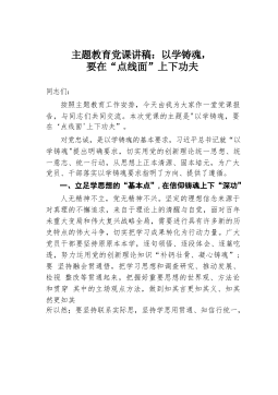 主题教育党课讲稿:以学铸魂,要在“点线面”上下功夫同志们:按照主题教育工作安排,今天由我为大家作一堂党课报告,与同志们共同交流。本次党课的主题是"以学铸魂,要在‘点线面'上下功夫”。对党忠诚,是以学铸魂的基本要求,习近平总书记就“以学铸魂"提出明确要求,切实用党的创新理论统一思想、统一意志、统一行动,从思想上正本清源、固本培元,为广大党员、干部落实以学铸魂要求指明了方向、提供了遵循。一、立足学思想的“基本点”,在信仰铸魂上下“深功”人无精神不立,党无精神不兴。坚定的理想信念来源于对真理的不懈追求,来自于理论上的清醒与自觉,面对百年未重大变局和伟大复兴战略全局,需要进行具有许多新的历史特点的伟大...