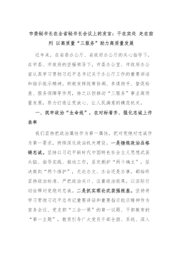 市委秘书长在全省秘书长会议上的发言:干在实处走在前列以高质量“三服务”助力高质量发展近年来,在省委办公厅、省政府办公厅的关心指导下,在市委、市政府的坚强领导下,市委办公室、市政府办公室认真学习贯彻习近平总书记关于办公厅工作的重要讲话和指示批示精神,积极发挥统筹协调、参谋助手、督促检查、服务保障等作用,持之以恒推动“三服务”事业高质量发展,努力打造让党放心、让人民满意的模范机关。一、筑牢政治“生命线”,在对标看齐、强化忠诚上作表率我们坚持把政治属性作为第一属性,把对党绝对忠诚作为第一要求,持续深化政治机关建设。一是锤炼政治品格铸忠诚。坚持以习近平新时代中国特色社会主义思想武装头脑、指导实践、推动...
