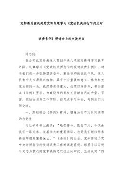 支部委员在机关党支部专题学习《党政机关厉行节约反对浪费条例》研讨会上的交流发言同志们:在全党扎实开展深入贯彻中央八项规定精神学习教育之际,认真学习《党政机关厉行节约反对浪费条例》,对于我们进一步弘扬艰苦奋斗、勤俭节约的优良作风,深入贯彻中央八项规定精神,具有十分重要的意义。作为机关党支部的一员,我深感责任重大,必须以身作则,带头落实《条例》要求,为建设节约型机关贡献自己的力量。下面,我结合自身工作实际,谈几点学习体会,与同志们共同交流。一、深刻领会《条例》精神,增强厉行节约反对浪费的自觉性习近平总书记强调:“艰苦奋斗、勤俭节约,不仅是我们一路走来、发展壮大的重要保证,也是我们继往开来再创辉煌的重要保证。”《条例》的出台,充分体现了党中央对厉行节约反对浪费工作的高度重视,彰显了以习近平同志为核...