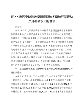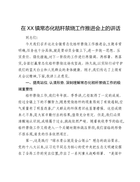 在XX镇常态化秸秆禁烧工作推进会上的讲话同志们:今天我们召开这次全镇常态化秸秆禁烧工作推进会,主题非常明确,任务也十分具体,就是要动员全镇上下,进一步统一思想、压实责任、强化措施,对下一阶段的工作进行再强调、再部署、再落实,全面打赢常态化秸秆禁烧这场攻坚战、持久战,以实际行动守护我们的蓝天白云和人民群众的身体健康。刚才,我们传达了上级有关会议精神,下面,我讲三点意见。 一、提高站位,认清形势,深刻理解常态化秸秆禁烧工作的极端重要性秸秆禁烧工作,我们年年抓、季季讲,已经取得了一定的成效。经过全镇上下的不懈努力,随意焚烧秸秆的现象得到了有效遏制,空气质量有了明显改善,广大群众的环保意识也显著增强。这些成绩来之不易,是大家辛勤付出的结果,值得充分肯定。但是,我们必须清醒地认识到,成绩属于过去,挑战...
