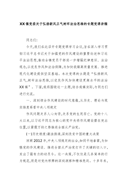 XX镇党委关于弘扬新风正气树牢法治思维的专题党课讲稿同志们:今天,我们在此召开专题党课学习会议,旨在深入学习贯彻习近平总书记关于加强党的作风建设的重要论述和习近平法治思想,推动全镇党员干部进一步增强纪律意识、法治观念,以优良作风和法治保障,为加快我镇高质量发展、推进现代化建设提供坚实基础。本次党课的主题是“弘扬新风正气,树牢法治思维,以优良作风加快建设更高水平的法治XX镇”。下面,我将围绕这一主题,结合我镇实际,与同志们进行交流。一、深刻领会作风建设的时代意蕴,从历史、理论与现实维度再看中央八项规定作风问题关系人心向背,关系党的生死存亡。党的十八大以来,以习近平同志为核心的党中央将作风建设摆在突出位置,以雷霆万钧之势推进全面从严治党。(一)历史维度:激浊扬清,深刻改变中国的重大决策回顾201...