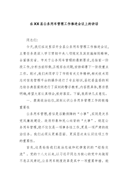 在XX县公务用车管理工作推进会议上的讲话同志们:今天,我们在这里召开全县公务用车管理工作推进会议,主要任务是深入学习贯彻中央八项规定及其实施细则精神,全面落实省、市关于公务用车管理的最新要求,总结前一阶段工作,分析当前形势,正视存在问题,安排部署下一阶段重点工作。刚才,我们共同学习了市级有关文件精神,相关技术同志对信息管理平台的操作进行了专业培训,县纪委监委的同志结合典型案例进行了深刻的警示教育,内容很具体,要求很明确,希望大家认真领会,抓好落实。下面,我再讲几点意见。一、提高政治站位,深刻认识公务用车管理工作的极端重要性公务用车管理,看似是后勤保障的“小事”,实则是关系党风廉政建设、政府形象和民心向背的“大事”。规范公务用车管理,绝不仅仅是一项事务性工作,更是一项严肃的政治任务。我们必须从...