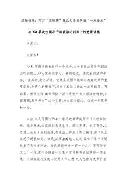 经验信息:巧打“三张牌”激活公务员队伍“一池春水”在XX县政法领导干部政治轮训班上的党课讲稿同志们:大家好!今天,很高兴能有这样一个机会,在全县政法领导干部政治轮训班上,和大家共同学习、共同交流。这次轮训班的举办,正当其时,意义深远。它既是巩固深化学习教育成果的重要举措,也是在新形势下,对全县政法工作的一次再动员、再部署。根据安排,由我围绕“深入贯彻中央八项规定精神,全面履职,勇于担当”这个主题,与大家谈谈心、交流一些思考和体会。当前,全县范围内的集中学习教育活动即将进入收官阶段。几个月来,大家通过系统学习、深入查摆、扎实整改,在思想上受到了深刻洗涤,在政治上得到了有力锤炼,在作风上实现了明显转变。但是,必须清醒地认识到,收官不等于收场,结束不意味着终止。作风建设绝非一朝一夕之功,不可能毕其...