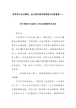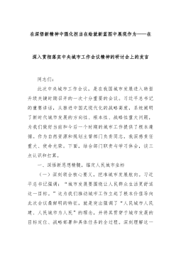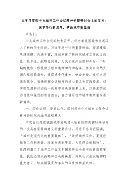 在深悟新精神中强化担当在绘就新蓝图中展现作为——在深入贯彻落实中央城市工作会议精神的研讨会上的发言同志们:此次中央城市工作会议,是在我国城市发展进入转型升级关键时期召开的一次十分重要的会议。习近平总书记的重要讲话,从推进中国式现代化的战略高度,系统阐明了新时代城市发展的方向性、根本性、战略性重大问题,为我们做好当前和今后一个时期的城市工作提供了根本遵循。作为自然资源和规划主管部门负责同志,我深感责任重大、使命光荣。下面,结合部门职责与学习体会,谈三点认识和打算。一、深悟新思想精髓,锚定人民城市坐标(一)深刻领会核心要义,把准城市发展航向。习近平总书记强调:“城市发展要围绕让人民群众生活更舒适这一目标。”这为我们推动城市工作立起了根本价值导向此次会议最鲜明的特征,就是突出强调了“人民城市人民建...