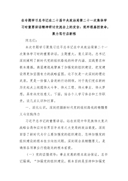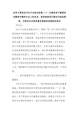 在学习贯彻总书记中央政治局第二十一次集体学习重要讲话精神专题研讨会上的发言:深学细悟笃行新时代组织路线,为经济社会高质量发展提供坚强组织保证同志们:这次中央政治局集体学习,聚焦“深入学习领会和贯彻落实新时代党的组织路线”,习近平总书记发表的重要讲话高屋建瓴、内涵深邃,是指导新时代党的组织建设的纲领性文献。深入学习领会这一重要讲话精神,对于我们深刻认识党的组织路线的重大意义、科学内涵和实践要求,切实把党建设得更加坚强有力,具有极其重要的现实意义和深远的历史意义。作为市委领导,必须带头学深悟透、融会贯通,坚决扛起抓党的组织建设的主体责任,带领全市党员干部切实把思想和行动统一到总书记重要讲话精神上来,确保新时代党的组织路线在XX市落地生根、开花结果。一、筑牢根基明方向:深刻认识新时代组织路线的根本...