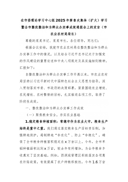 在市委理论学习中心组2025年第8次集体(扩大)学习暨全市整改整治和为群众办实事成效通报会上的发言(市农业农村局局长)尊敬的某某书记、某某市长,各位领导,同志们:根据会议安排,我就市农业农村局在整改整治和为群众办实事工作中的情况,以及结合习近平总书记关于加强党的作风建设的重要论述和中央八项规定及其实施细则精神,汇报如下:自整改整治和为群众办实事工作开展以来,市农业农村局坚持以习近平新时代中国特色社会主义思想为指导,深入贯彻落实市委、市政府的决策部署,紧紧围绕农业增效、农民增收、农村繁荣的目标,扎实推进各项工作,取得了阶段性成效。一、整改整治和为群众办实事工作成效(一)聚焦粮食安全,夯实农业基础1.稳定粮食种植面积:常德市作为农业大市,粮食生产始终是重中之重。我们通过落实粮食生产目标责任制,加...